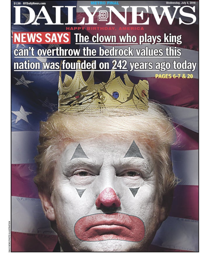 The New York Daily News is famous for its sometimes brutal covers. This is the one for July 4, 2018 -- accompanied by the subheading: "The clown who plays king can't overthrow the bedrock values this nation was founded on 242 years ago today."